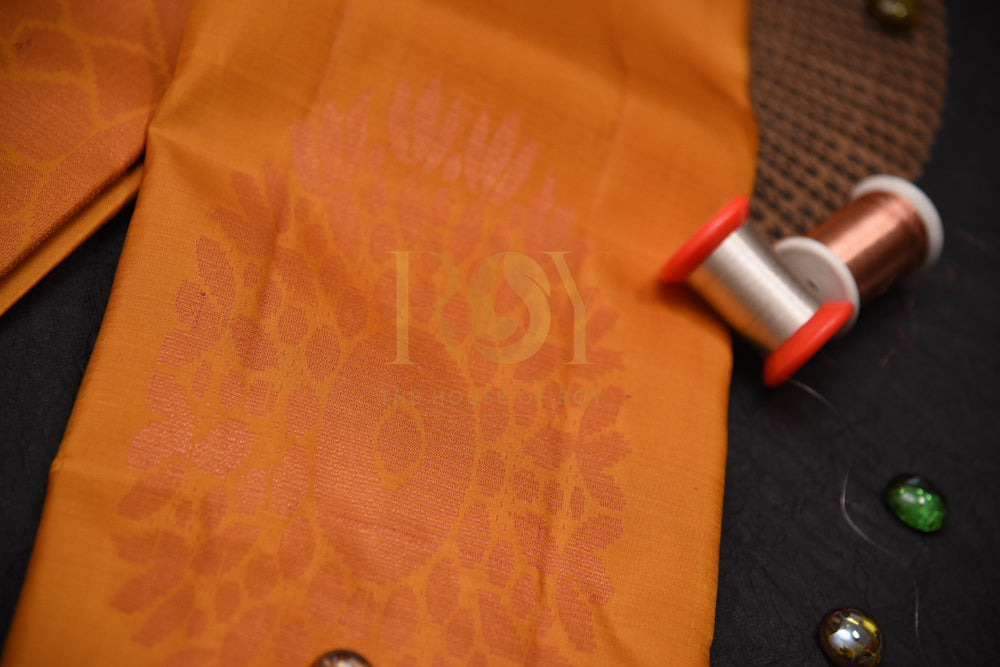 Unveil your inner radiance in this captivating Pure Kanchipuram Silk Saree! This vibrant orange beauty features a stunning borderless design adorned with a mesmerizing pink and gold zari peacock motif. Searching for affordable orange silk sarees, Kanchipuram silk sarees, or borderless silk sarees online? Look no further - Shop The House Of Roy now!
