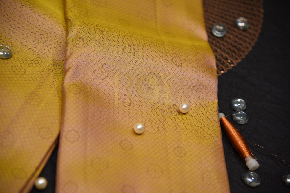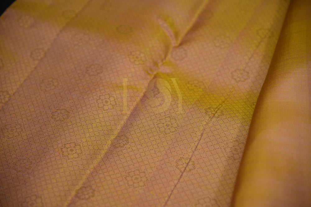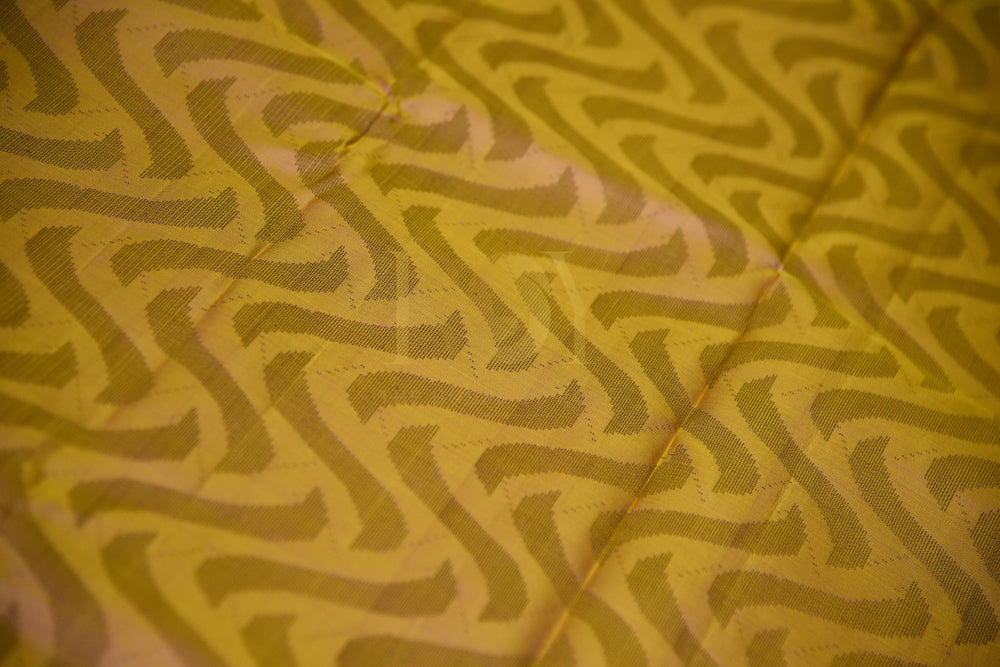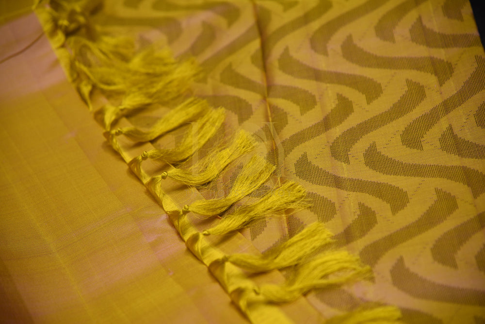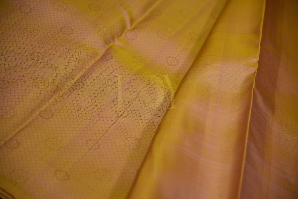 Unveil your inner sunshine in this captivating Pure Kanchipuram Silk Saree! Woven from the finest silk threads, this Kanjeevaram saree embodies the rich heritage and artistry of Kanchipuram silk weaving. Completed with a matching yellow silk blouse, this borderless pure Kanchipuram silk saree with self design & tiger stripe pallu is a statement piece waiting to be yours.