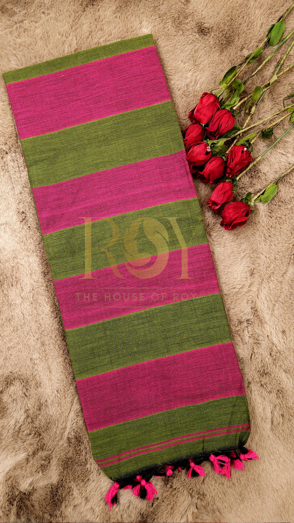 Green with Magenta Striped Khadi Mul Cotton Saree